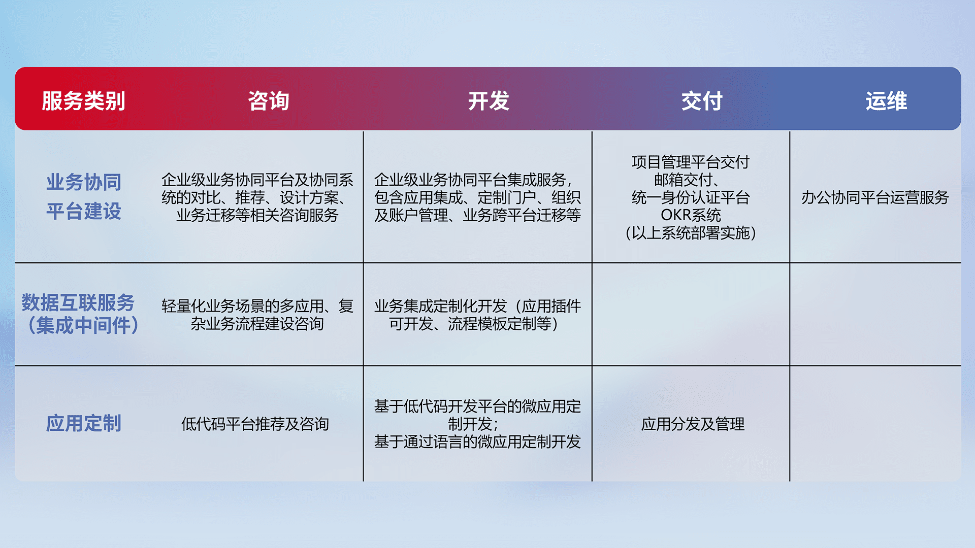 针对钉钉、、、企微、、IDaas等平台级产品提供产品的规划、、方案、、、交付、、定制化开发等服务,,实现如统一协同办公、、、、智能客户服务、、、、混合会议管理、、智能数据查询、、等业务场景,,,实现数字化转型。。。