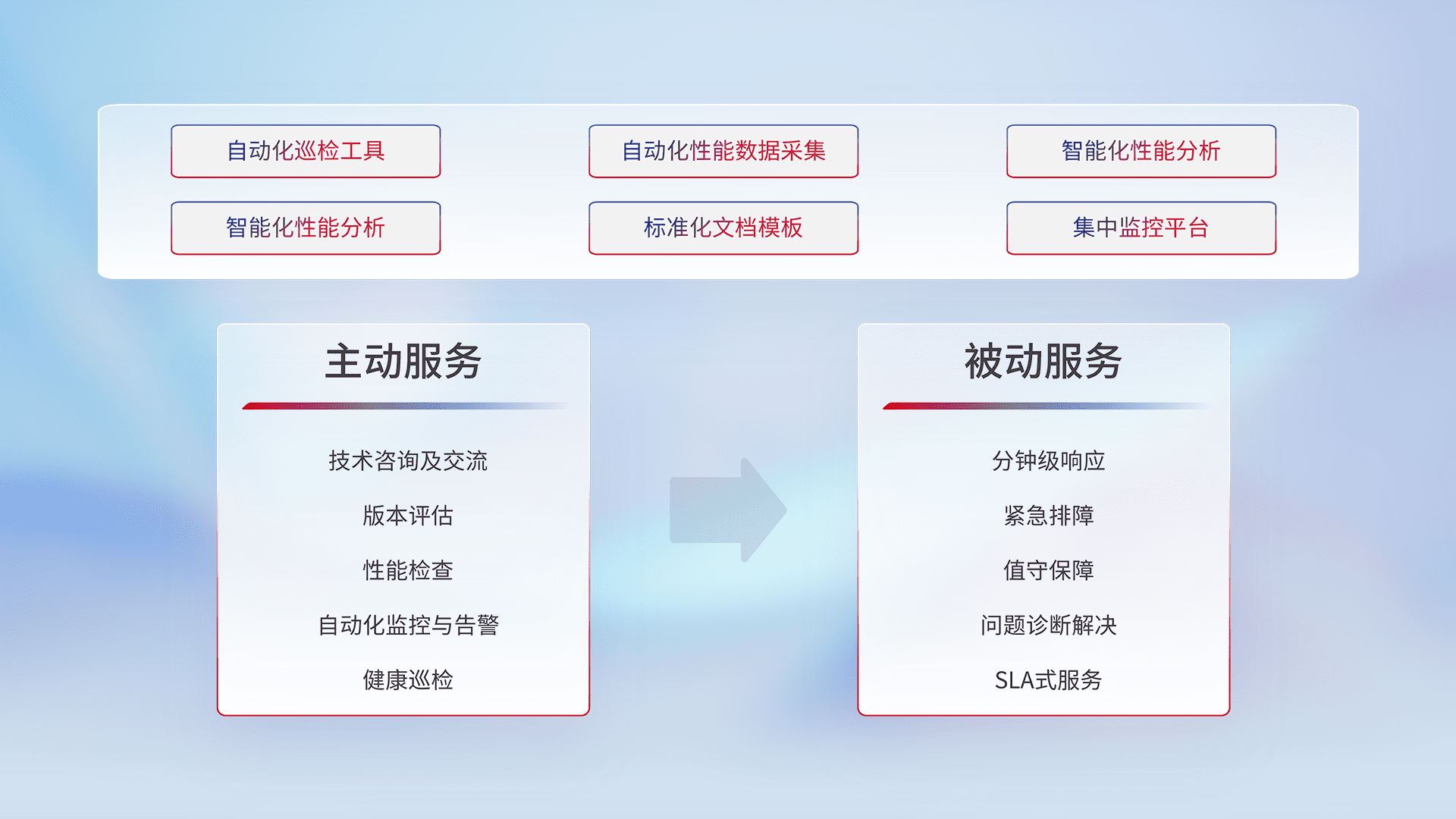 智能化工具和标准化文档,,,,保障服务质量,,,,提供主动服务(包含技术咨询、、版本评估、、性能检查、、、、自动化监控与告警、、、健康巡检)和被动服务包含(分钟级响应、、、紧急排障、、、、值守保障、、、、问题诊断解决、、SLA服务)。。
