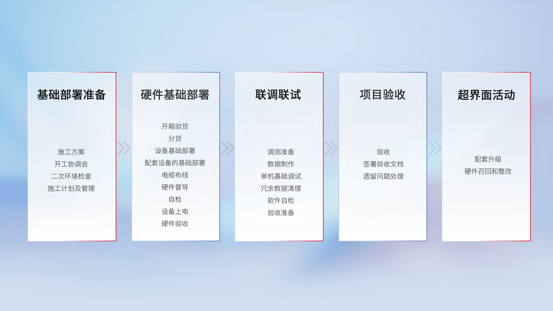 从基础部署准备、、、硬件基础部署、、、联调联试、、、、项目验收、、、越界面活动的全过程可追溯,,,保证施工质量和进度。。。。